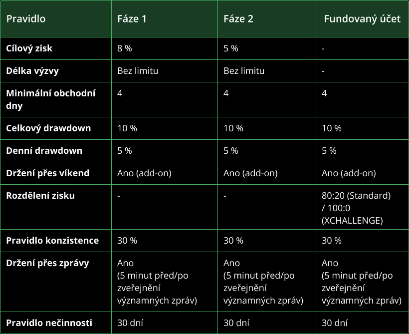 Cílem je dosáhnout Profit Targetu ve výši 8 procent z počáteční hodnoty účtu bez překročení stanovených limitů rizika.